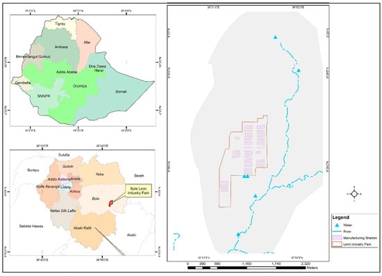 This study was conducted on the Bole Lemi River, which is found very close to the BLIP in the city of Addis Ababa, Ethiopia. The industrial park is located at the coordinates 8°58′17.2200″ N and 38°51′24.5088″ E (Figure 1).