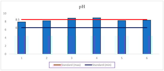 pH: pH is one of the most important water quality parameters that can affect the suitability of water for various uses [54,55]. The pH value of water is closely related to its concentrations of carbon dioxide (CO2) and alkaline substances [56]. In this study, the pH values were found to be alkaline, ranging from 7.90 to 8.92 (Figure 2). The maximum pH value was recorded at Sampling Site 4, where industrial effluents are discharged from industrial treatment plants (Table 5). This indicates a slightly alkaline river water, possibly due to untreated industrial wastewater discharge [54,57]. In addition, a higher pH value indicates a higher alkalinity, which indicates the presence of CO3+2, Ca2+, and Mg2+ in the river [58]. The lowest pH value was recorded at Sampling Site 1, an upstream sample site. This may be attributed to a relatively low anthropogenic influence.
