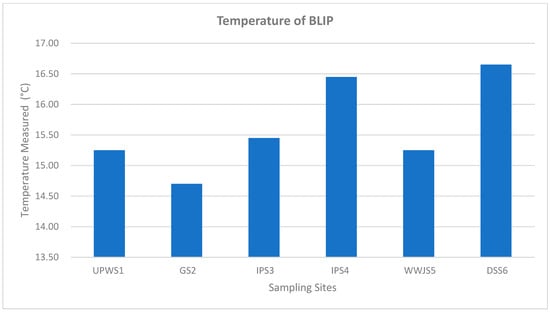 Water temperature: Water temperature affects the water quality parameters and plays an important role in aquatic life. Temperature is an important physical measure of water quality that affects the amount of dissolved oxygen (DO) in water ([57]. The temperature of polluted water may significantly affect its DO concentration [60]. The Lemi River receives wastewater from industrial parks, which may release warm water into the river system. The direct discharge of warm water from industries elevates water temperature [61]. This may raise the temperature of the river alongside its direct exposure to sunlight. The lowest and highest mean water temperature levels detected during the wet season of 2021 were 14.70 °C at Site 2 and 16.65 °C at Site 6, respectively. Yet, there was no significant difference (p = 0.99) in water temperature among the sampling stations (Figure 3). This deviates from the findings of [62] who reported that the highest water temperature in various water bodies in Nigeria was 28 °C, but is very similar to those of a study conducted in the town of Bahir Dar (15–20 °C) and to the Canadian recommended level of 15 °C [63].