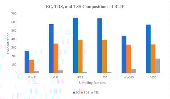 EC (µS/cm), TDS (mg/L), and TSS (mg/L) compositions at six different sampling stations.