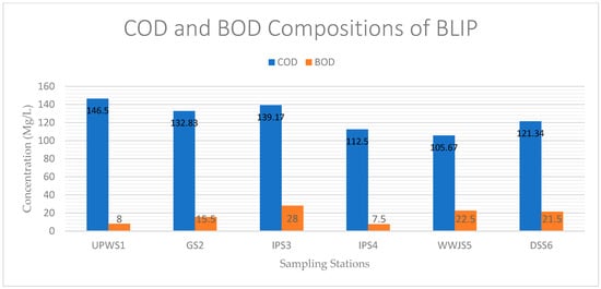 BOD and COD compositions at the six sampling sites.