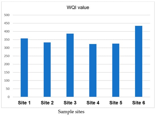 The results of the WQI for the water samples collected from the six sites along the river are summarized and presented as shown in Figure 7. It shows that all of the water samples analyzed during the study were found to be unsuitable for consumption and that the Lemi River’s water is not suitable for human use without treatment, but it might be acceptable for other purposes.