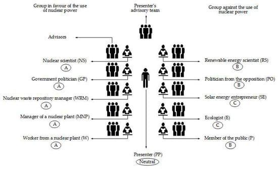 The roleplaying activity was about the agreement reached by the Spanish government and the country’s major electricity companies to gradually phase out nuclear power production over the period 2025–2035 [25]. The PPTs were organised in small groups between three and four students, each of them had to defend one role. In each small group, one of the PPTs was the spokesperson while the rest were the advisory team, with different tasks during the staging of the roleplaying activity. To prepare the roles, they received cards with the descriptions of different roles. This descriptions reflected three different positions about the pact which come from a position most strongly in favour of nuclear power to a position most strongly against: (1) no agreement with the pact, nuclear power production should continue indefinitely (position A); (2) agreement with the pact, nuclear power production should to phase out over the period 2025–2035 (position B); or (3) no agreement with the pact, nuclear power production should cease immediately, in 2020 (position C). For the staging of the roleplaying activity, the roles were organised into two groups: the group in favour of the use of nuclear power (roles in position A) and the group against the use of nuclear power (roles in positions B and C). The roles, their acronyms, the different positions about the pact and the groups for the staging can be seen in Figure 1.