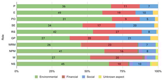 There is a similar behaviour in all roles in terms of the informal reasoning mode used in their contributions (Figure 2). In general, most of their arguments were environmental-oriented, followed by the financial-oriented and social-oriented arguments. Five roles (P, E, PO, RS and NPM) follow the same patterns shown in the general results (environmental > financial > social). However, the roles SE, GP, WRM, W and NS show different patterns: 1) SE and GP have more environmental-oriented arguments, then social-oriented and finally financial-oriented arguments; 2) WRM and W have more a similar number of environmental-oriented and financial-oriented arguments than the other roles; and 3) NS has the same number of financial-oriented and social-oriented arguments. The role with the most balanced use of informal reasoning modes is the GP.