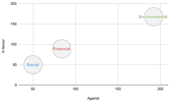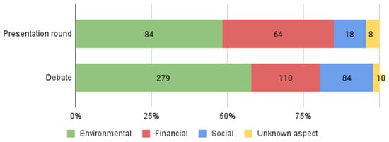 In the presentation round, where there were no interruptions and usually no counterarguments, there was a better balance between environmental-oriented and financial-oriented arguments (Figure 4). It was during the debate that more social-oriented arguments appear. Perhaps this indicates a shift in argument strategy, seeing that it might be more effective to launch social-oriented arguments.