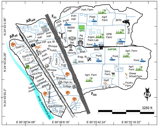 BAU campus in Mymensingh district consisting of 488 ha area was selected for this study considering huge green spaces and huge tree diversity of more than 450 different plant species. Among them, 424 species were considered under this study based on their total count of equal to or more than 25 (area basis tree species count are shown in the Supplementary Materials). The BAU campus is located in scenic rural surroundings on the western bank of the old Brahmaputra River, 5 km south from Mymensingh railway station and 120 km north from Dhaka, the capital city of Bangladesh. The study area map has been shown in Figure 1.