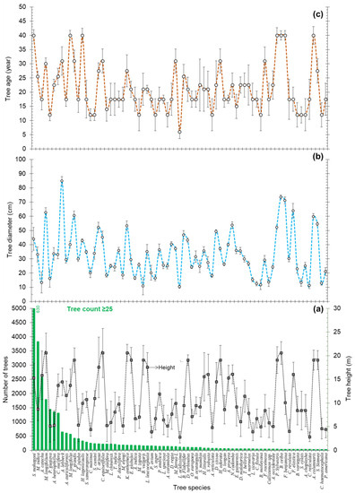 The major tree species (green bars) with their (a) height (black dashed line, in m), (b) diameter (blue dashed line, in cm), and (c) age (brown dashed line, in yr) within Bangladesh Agricultural University. Here the ‘major’ refers to trees having at least 25 or more in numbers.