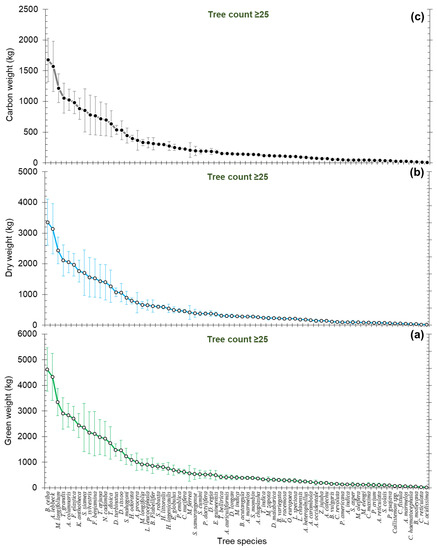 The major (≥25 in number) tree species with their (a) green weight (green line, in kg), (b) dry weight (blue line, in kg), and (c) C weight or C stock (black line, in kg) within Bangladesh Agricultural University.