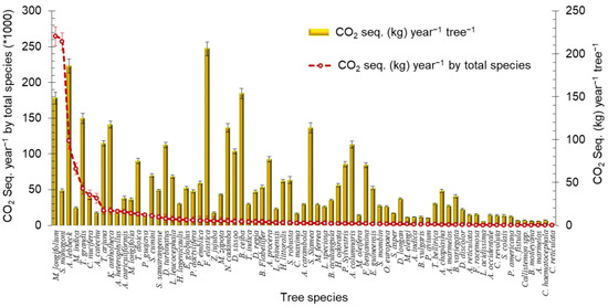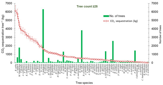 Decreasing the number of tree species enhances the emission of greenhouse gases (GHGs), including CO2. In addition, rapid urbanization is influencing the economic growth, human health, and vegetation with huge reduction of tree species [1]. From the land surface, most of the heat and radiation is trapped by increased CO2 [2] and can affect human health if the concentration becomes higher [3]. Carbon sequestration (CS) is the entire volume of C that stocks in above and below the earth whilst the route depends on tree growth and mortality. CS is the process of increasing the volume of C by improving C sinks [4]. Urban trees and green spaces provides multiple communal, artistic, landscape, corporal, ecological, and commercial profits. Among these are dropping air pollution and refining air quality [5] by collecting road dusts, adjusting rainfall-generated overflow [6], regulating microclimates [7], decreasing noise pollution [8], providing wildlife habitat [8,9], qualifying the heat island effect, and reducing electricity consumption [10]. Trees also possess vital role in moderating atmospheric CO2 by sequestering CO2 inside trees and storing CO2 in tissues [11]. Additionally, CO2 can be consumed by microalgae or transformed to chemicals and energy [12]. Regarding utilization, CO2 can be used as an important C source to produce valuable chemicals and fuels [13,14], and can be reused via photocatalytic reduction into hydrocarbons [15]. In nature, CO2 can be deposited in sea rocks and trees whilst, deep saline aquifers have enormous C storing ability through salinization [16,17]. Vigorous captivation of CO2 from the atmosphere over photosynthesis, and its subsequent loading in the growing trees or plants is the C storage [18,19]. More C accumulation in the air will reveal more impact to global warming and climate alteration. Though the serious concerns of climate change are swelling with a motivation for climate change action, no durable action measures have been seen to inhibit climate change consequences so far [20]. Additionally, overuse and mismanagement of natural resources results natural exhaustion, imbalanced natural ecosystems and biochemical cycles [21]. Therefore, to know the contribution of plant species in CS and accumulation is important to balance this situation. On the other hand, government and general people understand the necessity of conserving and to increase number of trees. Various research has been carried out concerning CS in temperate forests, agro-forestry, plantations, and reserve forests [22,23,24].