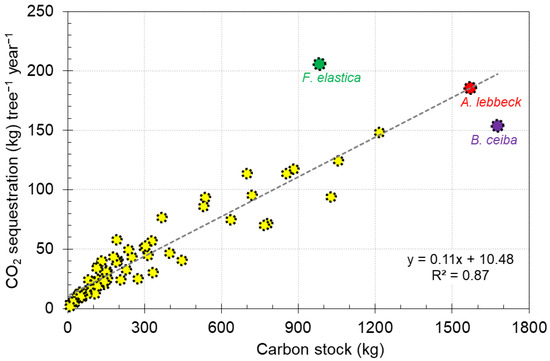 Finally, the weight of CO2 sequestered in the tree was divided by the age of the tree to determine the weight of CO2 sequestered yr−1 tree−1 [55]. The simple equation is: