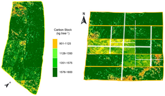 A C stock map for BAU-BG is shown in Figure 8 (left panel) due to its abundant role in C stock at BAU. In FAS, the largest volume of C stock was found in the BAU-GPC with 1576–1800 kg tree−1. Due to its enormous importance, it has been shown more comprehensively in Figure 8 (right panel). Though the BFRI area possess C stock less than GPC (1351–1575 kg tree−1) but represents the 2nd important place in regard to C stock. A comparatively bigger area in the middle of FAS contributes zero (0) C stock as these areas are solely experimental crop field and were out of this study.