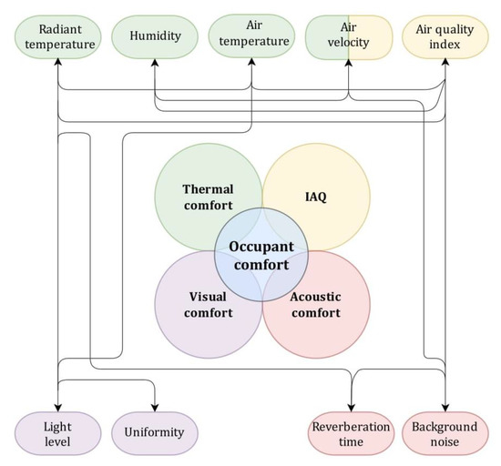 Nowadays, indoor use accounts for 30–40% of total energy usage in the world [1]; additionally, the share of energy consumed by the building sector has increased by up to 50% [2]. Around 39% of greenhouse gases generated by the construction and building sector in 2018 came from process- and energy-related activities [3]. About 55% of the world’s electricity is also used by the building sector [4]. Today, people spend 80–90% of their time indoors [5], and the indoor environment quality (IEQ) has a substantial impact on health [6], work efficiency [7], and user’s perceptions [8]. Additionally, IEQ includes aspects of occupant comfort (i.e., thermal, visual, acoustic, and indoor air quality (IAQ) satisfaction) [9]. As shown in Figure 1, there are relationships between these aspects; they are not independent [10]. The arrows illustrate the interrelation of each aspect of comfort. The US Environmental Protection Agency has classified IAQ dissatisfaction as one of the principal five environmental threats to public health [11]. The World Green Building Council [12] explains that distracting noise has reduced people’s productivity and concentration by 66%. Therefore, society’s understanding of the impact of the indoor environment on people’s comfort and health has increased.