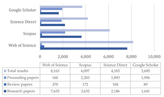 The initial search was conducted on 13 August 2022 based on the term “occupant comfort in buildings” in the titles, abstracts, and keywords of the articles. Web of Science, Scopus, Science Direct, and Google Scholar were chosen as scientific databases. The publication range of articles was set “from 2002 to the present” and the results are presented in Figure 3. Among these four databases, the Web of Science platform recorded the largest number of documents in the type of research articles, review articles, and theses.
