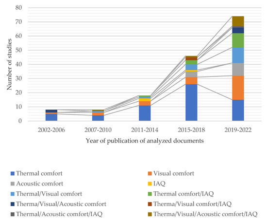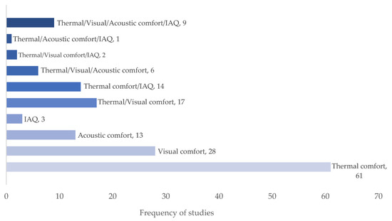 According to Figure 8, the predominant aspect of comfort was thermal comfort, whereas visual comfort, acoustic comfort, and IAQ were less prevalent. The primary purpose of single-factor analyses is to identify the parameters that have an impact on a particular aspect of comfort. These parameters consist of building or envelope properties [44,46,49,50,51,52], architectural design elements [48,53,54,55,56], environmental or individual parameters [45,57,58,59], and IEQ [60,61].