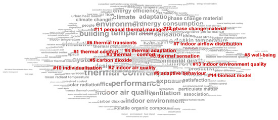 The title, keywords and abstracts of 391 publications were analyzed by CiteSpace software, and 14 clusters were identified, which are shown in the Figure 5. Thermal sensation was recognized as the most important topic among the articles by the software. First, the authors studied the full texts of articles related to clusters #0, #2, #5, and #13, followed by clusters #1, #3, #4, #7, and #8. Then, the abstracts and results related to articles of clusters #1, #6, #10, #11, #9, #14, and #13 were read. In this review, the studies that did not include the considered factors about indoor occupant comfort assessment that are given in Section 3.2 to Section 3.6 were excluded. Finally, 154 articles remained, and the continuation of the paper is basically based on these articles.