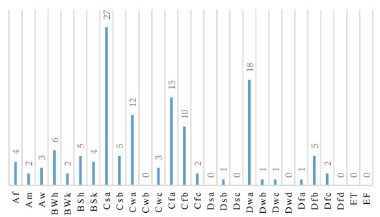 Diversity of Köppen climate classification among analyzed documents. Af: tropical rainforest climate; Am: tropical monsoon climate; Aw: tropical savanna; BWh: hot desert climate; BWk: cold desert climate; BSh: hot semi-arid (steppe) climate; BSk: cold semi-arid (steppe) climate; Csa: hot-summer Mediterranean climate; Csb: warm-summer Mediterranean climate; Cwa: monsoon-influenced humid subtropical climate; Cwb: subtropical highland climate or temperate oceanic climate with dry winters; Cwc: cold subtropical highland climate or subpolar oceanic climate with dry winters; Cfa: humid subtropical climate, Cfb: temperate oceanic climate; Cfc: subpolar oceanic climate; Dsa: hot, dry-summer continental climate; Dsb: warm, dry-summer continental climate; Dsc: dry-summer subarctic climate; Dwa: monsoon-influenced hot-summer humid continental climate; Dwb: monsoon-influenced warm-summer humid continental climate; Dwc: monsoon-influenced subarctic climate; Dwd: monsoon-influenced extremely cold subarctic climate; Dfa: hot-summer humid continental climate; Dfb: warm-summer humid continental climate; Dfc: subarctic climate; Dfd: extremely cold subarctic climate; ET: tundra; EF: ice cap climate.