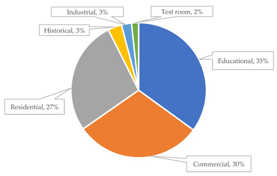 In this review, building types were classified into educational, commercial, residential, historic, industrial, and test rooms. When choosing variables and applying comfort models, it is important to consider the building type. Historical buildings are acceptable examples that can be used to further explain this question. These types of buildings, such as museums, are very sensitive to the application of measures because preservation is important to them. Therefore, HVAC systems must guarantee the integrity of the artworks and the comfort of the visitors with maximum energy efficiency [168]. As illustrated in Figure 11, most of the case studies of the analyzed studies were in the educational type. Generally, the attention of researchers was more on educational (35%) than on commercial (30%), residential (27%), historical (3%), industrial (3%), or test rooms (2%) building types in all case studies in the analyzed documents.