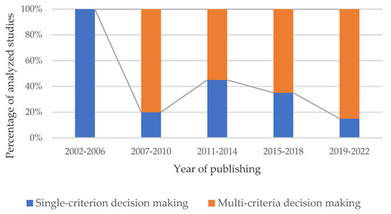 Percentage of single-criterion or multi-criteria problems in analyzed documents according to publishing year.