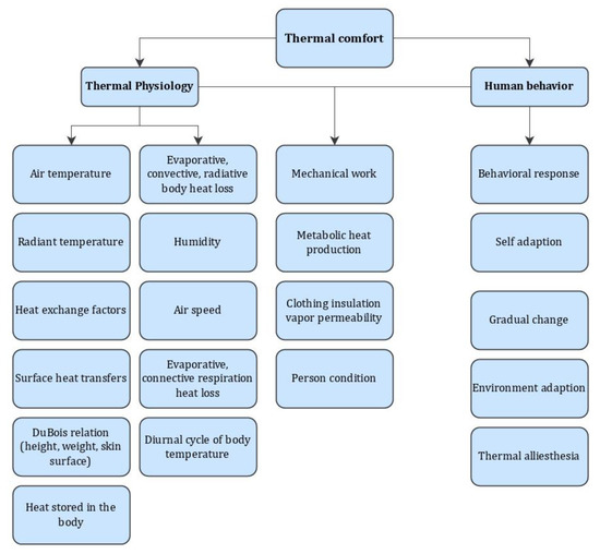 The concept of thermal comfort has long been a topic; it was introduced at the beginning of the last century, and has been studied extensively around the world, especially in the fields of architecture and engineering [9]. Thermal comfort is defined in ISO Standard 7730:1994 [22] and ASHRAE (American Society of Heating, Refrigerating and Air-Conditioning Engineers) Standard 55 [23] as “that condition of mind which expresses satisfaction with the thermal environment.”, i.e., the condition when someone is not feeling either too hot or too cold. In addition to being a potential health hazard, a poor thermal environment affects people’s abilities to work effectively, their satisfaction at work, and their likelihood of remaining customers [24]. Therefore, building design must guarantee the means of achieving an acceptable indoor environment [25].