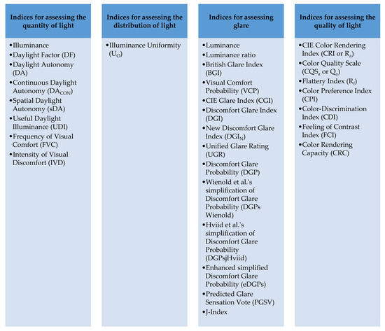 Visual comfort is another important factor in evaluating occupant comfort in buildings, which is defined by a series of criteria related to the amount of light in the environment, contrast balance, color temperature, and the absence or presence of indoor glare [27]. In general, visual comfort means “the state of mind that expresses satisfaction with the visual environment” [28]. However, too much or too little light will also lead to visual discomfort for the occupants and harm their efficiency and satisfaction [29,30,31].