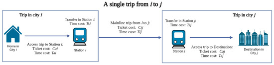 The travel friction represents the traveller’s cost for the whole journey in two main forms, monetary cost and time cost. Both types can be subdivided according to each travel section. If a passenger travels by HSR from city to city , he needs to pay: