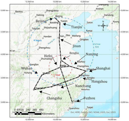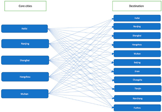 In the past two decades, HSR has developed rapidly in China. The first HSR that connected the cities of Hefei and Nanjing was opened in August 2008. Until 2010, the Shanghai–Beijing and Nanjing–Shanghai services transported hundreds of millions of passengers and linked China’s economic and political centres, establishing the basic framework of the China high-speed railway network (CHR). In the following years, the network was extended and covered most of the provincial capitals around the east of China. The period from 2005 to 2015, with a 3-year non-HSR service period and 8 years of HSR development, was selected for the case study, to reflect the popularising progress of HSR. Five main HSR hub cities, Hefei, Wuhan, Nanjing, Shanghai, and Hangzhou, were selected to be the core sample cities as the service departure points and destinations. Another six cities at the edge of the area, Beijing, Jinan, Changsha, Tianjin, Nanchang, and Fuzhou, were introduced as the service destinations. The case samples and service structure are shown in Figure 3 and Figure 4. The whole sample pool could generate a panel with data from 55 high-speed services and 11 years for accessibility estimation and model validation.