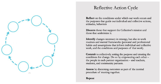Participatory action research (PAR) is a method within a structured and systematic process for continually improving decisions, modes of governance, management policy and practices by studying and learning from the outcomes of decisions previously taken. It is an iterative process in which practitioners test hypotheses and adjust behavior, decisions, and actions based on what they learn. Action research facilitates social learning by involving participants as co-researchers who can steer inquiry, test ideas, gain new knowledge, ask questions, and engage in collective decision making. Figure 2 models the basic process used in this study, the Reflective Action Cycle. Together, lead researcher and co-researchers gather and analyze information in a continuous or ‘spiral’ process of learning and reflection. The role of the lead researcher is to be a good learning partner, engaging members in a facilitated, participatory process of inquiry to gain a deeper understanding of their needs and talents, co-design areas for growth that build on this knowledge, communicate findings back to the Collective as discoveries are made, and (importantly) engage co-researchers in the process of interpreting the findings.