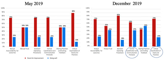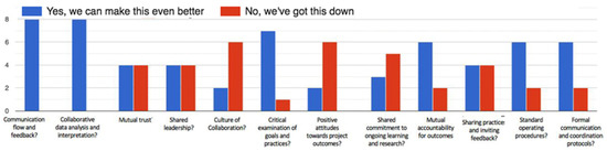 The fourth source of data collection was an online survey designed to reveal perceptions about indicators of collaborative capacity and multi-level learning [100,101]. This survey was a small-n tool, with a participating group between 10 and 12 people. It was not designed to look for statistically significant effects, but to (a) gather perceptions and insights of people designing a truly novel social change partnership, and (b) create a rough baseline for CSEA on indicators with something to say about inter-organizational network effectiveness. The surveys also provided some clues as to the measures that are likely to be most effective building collaborative capacity (see Table 2). Finally, they provided a mechanism for partners to assert agency over the research agenda. Following these trends over time allowed us to assess the effectiveness of actions and decisions. The survey was designed to explore goals, governance, administration, and accountability factors mentioned earlier, via the associated process variables under study.