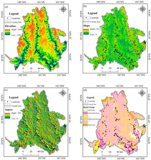 Elevation is a basic index reflecting topography [30] (Figure 2a). Elevation plays an indirect role in the breeding and development of geological hazards [31]. The first factor to consider is groundwater action. Many studies have pointed out a correlation between groundwater and geological hazards [32]. Muli County comprises a mountainous terrain. With increasing elevation, the groundwater has less impact on the likelihood of geological disasters. The second factor is the scope and intensity of human activities. Generally, human activities mostly occur in areas of lower altitudes and flatter terrain, so the higher the altitude, the smaller the scope of human activities, and the lower their intensity.