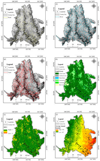 Land use cover types refer to the different forms of human modifications of geotechnical bodies, which modifications destroy the natural environment’s ability to self-regulate to a certain extent [27]. For example, the construction of panhandle roads affects the soil’s natural ability to be infiltrated with rainwater, which leads to the gathering of rainwater and the scouring of slope bodies; this causes soil erosion and can even trigger geological disasters. Therefore, it is generally believed that the more fragile the land type, the greater the probability of landslides (Figure 2h).