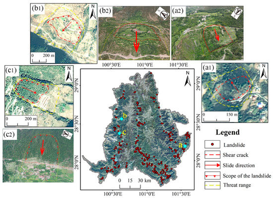 Demonstration of landslide delineation work. a,b,c are typical landslides in the study area, (a1,b1,c1) are remote sensing images, (a2,b2,c2) are corresponding aerial images of UAV.