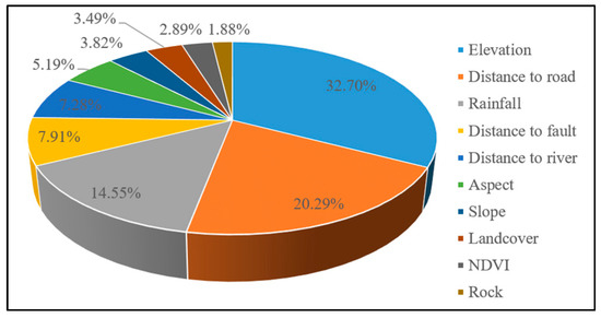 The weights of the factors of the established random forest model have been yielded, and the results are shown in Figure 7. There are 10 factors that contribute to the proliferation of landslides, among which the three factors of elevation, distance from the road, and average annual rainfall are the most important, the sum of the importance of which reaches 67.54%. Distance from the fault, distance from the river, and the aspect are the next most important factors, while slope, land use type, vegetation index, and rock group make the least contribution to the occurrence of landslides.