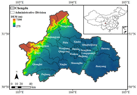 Chengdu, China’s Sichuan Province, was chosen as the research region for this work. Chengdu has strengthened its investment in ecological civilization and committed itself to the development of urban ecological civilization in recent years. The link between urban ecological civilization and human activity is the analysis of the sustainable urban ecological environment and human activities against the backdrop of urgency. Chengdu is divided into 12 municipal districts, 3 counties, and 5 county-level cities, with a total size of 14,335 km2 and a built-up area of 949.6 km2 under its control. It has a permanent population of 16,581,000 people and a city population of 12.3379 million people, with a 74.41% urbanization rate. Figure 1 illustrates this.