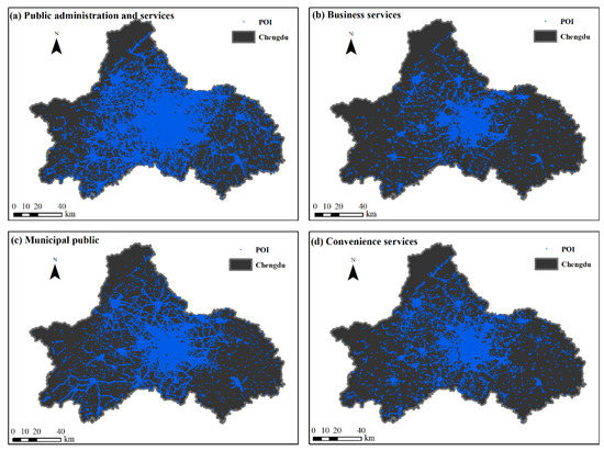 - POI data, a total of 16 industry categories and more than 370,000 points (September 2020), is shown in Figure 2a–d.