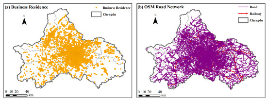 - Residential area data were screened out from POI points as “residential area” and the data were cleaned, as shown in Figure 3a.
