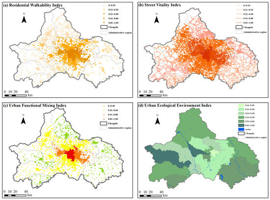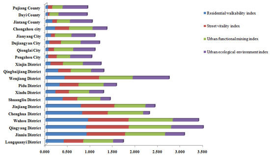 The Figure 5 shows the results of the examination of the indicators’ numerical status in each district and county of Chengdu. The distribution of residential walkability index, street vitality index, and urban functional mixing index can be divided into high value area and low value area. Areas with high values included Jinniu, Qingyang, and Wuhou districts. Low readings were recorded in the Xinjin District, Dayi County, Pujiang County, Chongzhou City, and Qionglai City areas. Through Figure 5 and combined with Figure 1, geographical location found that the high value area is dispersed throughout the central city; whether it be educational institutions, urban construction projects, medical and health care facilities, or cultural endeavors, they are all closely grouped together, and the population is dense, the traffic is accessible, the urban environment is rich, and the intensity of human activity is high. Low-value regions are scattered around the major urban area, and since they lack the population, infrastructure, and services necessary for rapid urban growth, they are unable to develop economically. As a result, the intensity of human activity in these places is relatively low. In addition, the distribution of the sustainable urban ecological environment index revealed that, in contrast to the city center, most of Chengdu is prioritized to have hills, forest land, and wetland, complex terrain, traffic inconvenient, corresponding service life and the scarcity of public facilities, unsustainable population necessary life services, making the ecological environment quality better; however, Wuhou District and Qingyang District, which are the center of Chengdu, have the worst ecological environment quality.