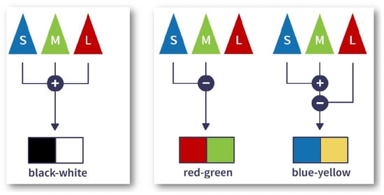 It is well-known that the trichromatic theory of color vision explains how human beings (their cells) detect blue, red, and green wavelengths. The combination of these three main colors allows perception of the whole visible spectrum [15]. However, the current understanding of color perception is more complicated. In particular, a key role is played by the opponent colors theory. This theory was developed by Ewald Hering, who based it on the observation that specific color combinations cannot be seen [79]. The latter is based on the human ability to perceive color that is mainly based on three receptor complexes: the red–green complex, the blue–yellow complex, and the black–white complex [17]—see Figure 2. As matter of fact, recently, the pairings above have been refined as blue–yellow, red–cyan, and green–magenta.