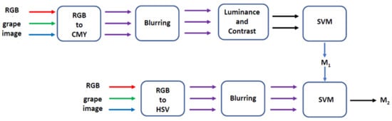 Regarding the second classification step, as already mentioned in the previous section, it is necessary to also account for the peculiar grape color that changes in agreement with both the stage of grape ripening and the kind of vineyard. Hence, the feature vector is defined as in Equation (3) and feeds the SVM-based classifiers producing the final classification map .