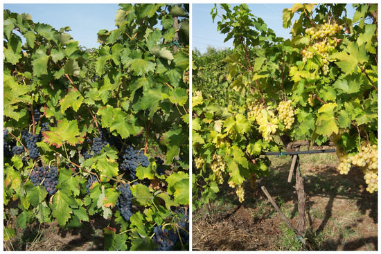 Two examples ( RGB images) of grapes in the considered vineyard: (Left) blue grapes and (Right) yellow grapes.