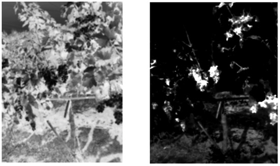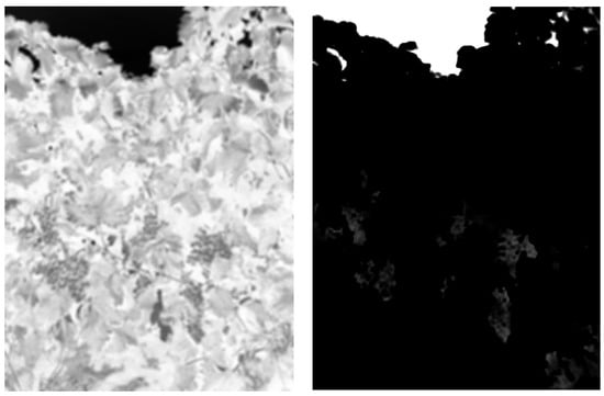 Though a slight modification, yellow grape detection follows the same strategy adopted for blue grapes. Before showing it, two considerations have to be made. The first is that yellow grape detection is more difficult. As shown in Figure 4 (Right), grapes have a color that is a mixture of red and yellow, while leaves are characterized by a mixture of green and yellow. The contrast in this case is more light. The second consideration is relative to the selected CMY space, where the subtractive primaries of cyan, magenta, and yellow are the opposing colors to red, green, and blue. Specifically: