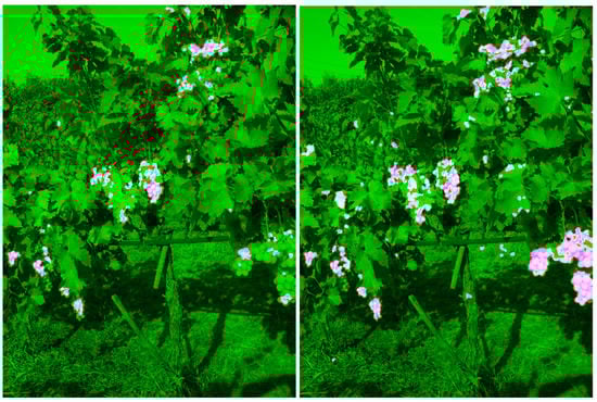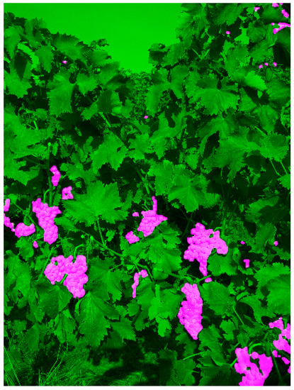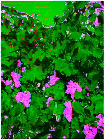 Blue grapes: Final classification map superposed on the original RGB image in Figure 4 (Left)—pixels classified as blue grapes are in magenta.