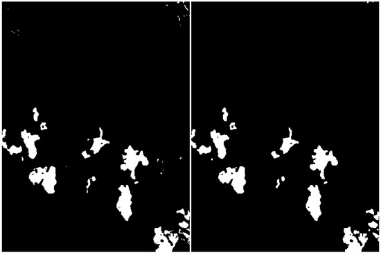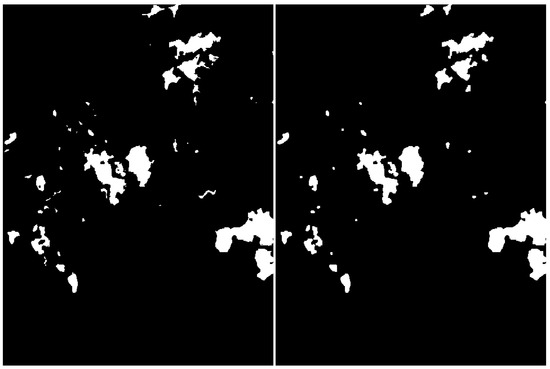 The second SVM-based classification led to the map shown in Figure 7 (Left). The post-processing step consisted of a morphological opening [96] on the resulting binary map , where the radius of the disk was set equal to 10. This step eliminates some spurious and isolated points due to a bad classification, thus, leading to the final map in Figure 7 (Right). This step has not been inserted in the scheme in Figure 3 as it simply refines the achieved result without greatly increasing the framework performance.