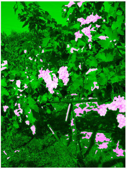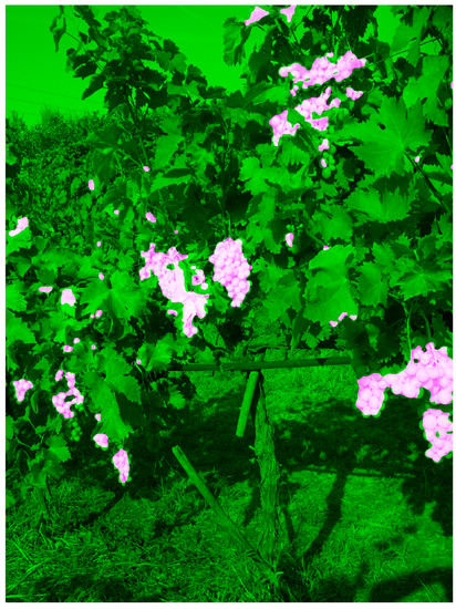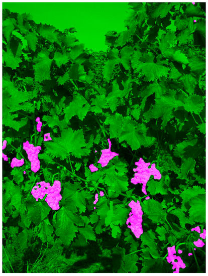 The following strategy was adopted to exploit the opposite components. In particular, magenta was selected as opposite to green (i.e., an approximation of leaves color), while cyan was selected as opposite to red (i.e., an approximation of grapes color). In this case, the common shade of yellow that characterizes both object (grape) and background (leaves) was considered to be self-vanishing.