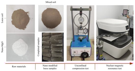 The materials utilized in the current research included loess soil, NM, and distilled water (Figure 1). The loess soil was collected from a depth of 2.0~2.5 m beneath the ground of a high-speed rail construction site in Xi’an, China (Figure 2). It was mustard yellow in color and was classified as low-plasticity clay (CL) according to the unified classification system. Table 1 lists the physical properties determined as per ASTM D422-63, D854, and D4318 [39,40,41]. The mineral components based on the X-ray diffractometer test were also provided. The NM material was a white, nano-scale, high-purity MgO powder procured from a firm in Guangzhou, Guangdong Province, China. The physical and chemical properties are presented in Table 2.
