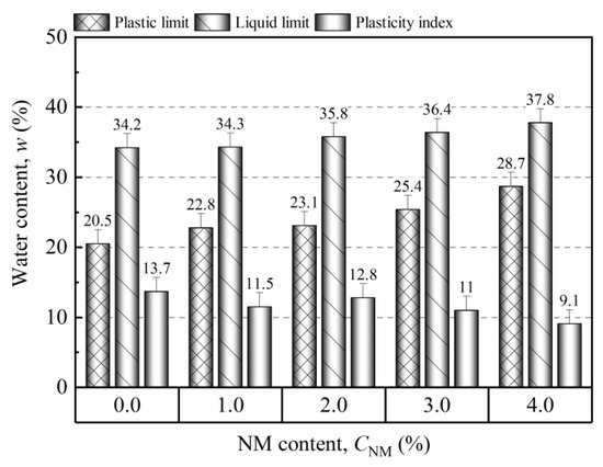 Figure 3 illustrates the variations of the plastic limit (PL), liquid limit (LL), and plasticity index (PI) with the addition of NM. Generally, both LL and PL increased with the addition of NM. The growth of PL was more remarkable than that of LL, therefore, resulting in a decreasing trend of PI with increasing NM. Specifically, as NM increased from 0% to 4%, PL and LL increased by 40.00% and 10.53%, respectively, while the corresponding PI decreased by 33.58%. This phenomenon suggested improved water-absorption ability, which could be attributed to the great specific surface area (SSA) and surface charge of NM particles. However, the reduction in PI with increasing fine-grained additives is interesting, but common in the design of stabilized soils [31,47]. In such situations, the decrease of PI is not due to the reduction of LL, but rather the comparatively higher growth of PL than that of LL.