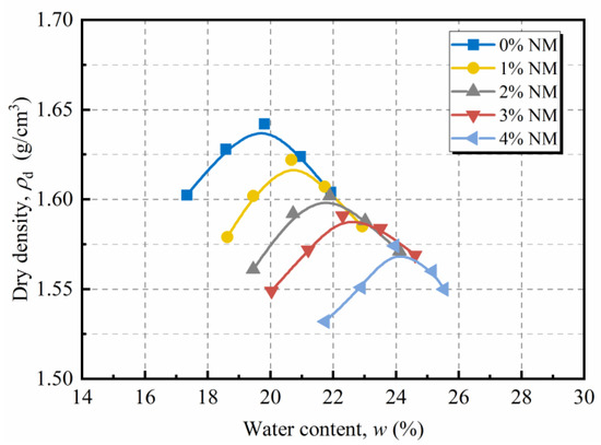 Figure 4 illustrates the standard compaction data of loess treated with 0%, 1%, 2%, 3%, and 4% NM. It can be seen that adding NM from 0% to 4% led to an increase in wopt from 19.8% to 23.9%, yet a decrease in from 1.64 g/cm3 to 1.57 g/cm3. Similar observations were also reported in previous works on soils treated with fine-grained stabilizer [31,48]. The increase in wopt was probably due to the excellent water-absorption capacity of NM [49,50], and the change-down in could be attributed to the following reasons: (1) NM particles having thicker bound-water films and lower specific gravity compared with that of soil particles; (2) the increased interparticle bonding force by adding NM, which prevented easy compaction. Therefore, the more the NM was added, the higher the wopt was, and the lower the was.