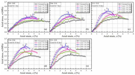 The shapes of stress–strain curves varied wildly with NM content. For the cases of natural loess, ductile behavior was manifested, with a gentle rise and mild decline of stress, respectively, in the pre- and post-peak phase. With the addition of NM (≤2%), both the peak-strength and growth rate rose, and the post-peak drop in stress became increasingly pronounced. In addition, the strain corresponding to peak-stress, , decreased gently with the addition of NM. As a result, the NM-treated samples exhibited much more brittle behavior than the untreated one. However, it was also found that excessive NM addition (>2.0%) would lead to declines in both strength and brittleness. As for the effects of curing, the longer the curing time was, the more brittleness the sample exhibited. Yet, the effects of curing on brittleness were less significant than that of NM.