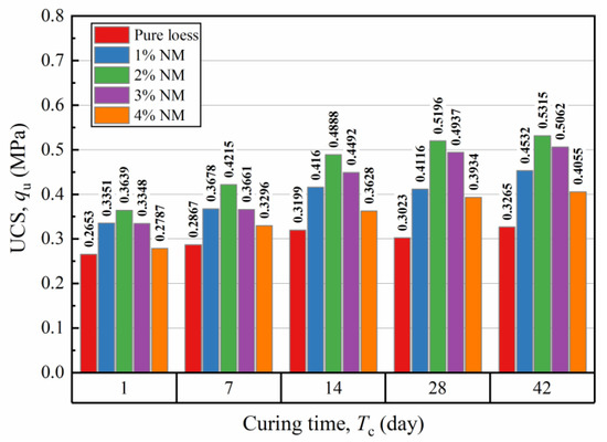 UCS of NM-treated loess with varying NM contents and curing times.
