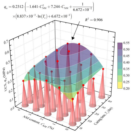 As discussed above, the NM content and curing time were two crucial factors controlling the UCS of NM-treated loess. In this part, the following function was attempted to describe the relationship between UCS and these factors: