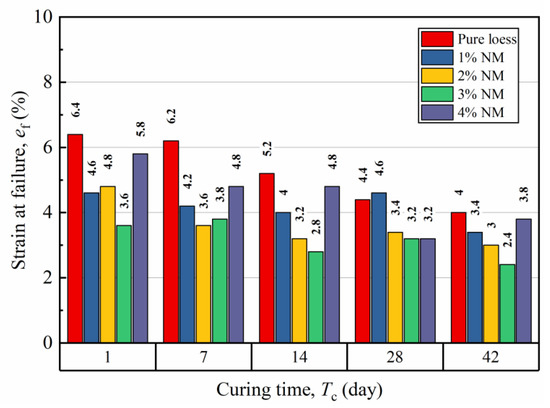 Figure 8 presents the strain at failure with various NM contents and curing times. It was observed that most -values distributed in the range of 2.4% to 6.4%. Adding NM to the natural loess led to a decline in at low NM levels (≤2%). Thereafter, with further NM addition, an ascending trend of was observed. Meanwhile, generally decreased with increasing curing time. In this way, reached its minimum (2.4%) at 3% NM content and 42 days of curing. It is noteworthy that the changing tendency of was just the opposite of the trend of , indicating a probable correlation between them.